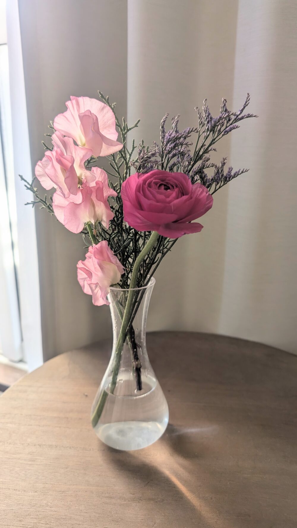 今年2回目に届いたお花。前回とは変わって、少しくすみ感がありシックな雰囲気でした!シックな中にもピンクのスイートピーのかわいらしさが良い感じです。