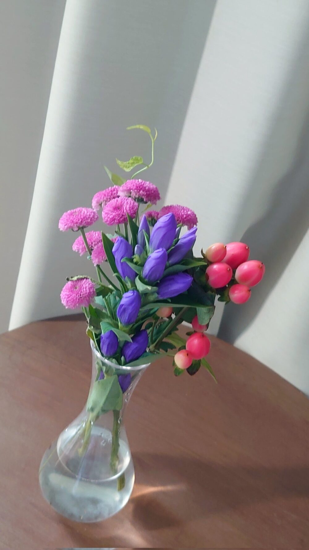 ちょうど秋めいてきた頃に届いたお花。少しダークめの印象ですが、その中で薄い赤のヒペリカムが可愛らしく、秋の夜と実りの秋って感じがしました。