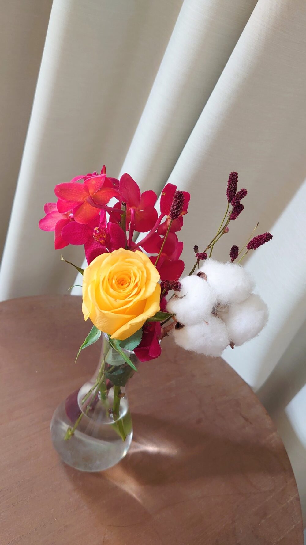 ちょっと色が派手め。コットンとワレモコウが面白い組み合わせ。こういった自分ではなかなか選ばないお花が楽しめるのもお花の定期便の醍醐味です。10月だからちょっとハロウィン感?(←濃い赤と白いコットンが血とオバケみたいな…バラがオレンジ色だったらもろハロウィン)