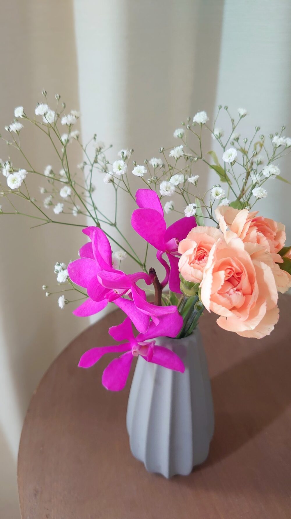 ちょっと可愛いめの組み合わせ。可愛らしい色のスプレーカーネーションとカスミソウに、モカラのアクセントがいい感じです。スプレーカーネーションは、花持ちが良く長く楽しめていいです。
